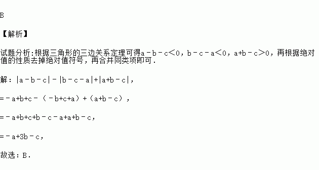 B 【解析】 试题分析:根据三角形的三边关系定理可得a﹣b﹣c<0,b﹣c﹣a<0,a+b﹣c>0,再根据绝对值的性质去掉绝对值符号,再合并同类项即可. 【解析】 |a﹣b﹣c|﹣|b﹣c﹣a|+|a+b﹣c|, =﹣a+b+c﹣(﹣b+c+a)+(a+b﹣c), =﹣a+b+c+b﹣c﹣a+a+b﹣c, =﹣a+3b﹣c, 故选:B.