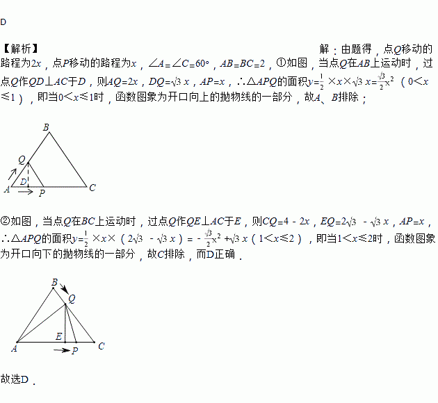 如图,等边△ABC的边长为2cm,点P从点A出发,以1cm/s的速度沿AC向点C运动,到达点C停止;同时点Q从点A出发,以2cm/s的速度沿AB﹣BC向点C运动,到达点C停止,设△APQ的面积为y(cm2),运动时间为x(s),则下列最能反映y与x之间函数关系的图象是( )