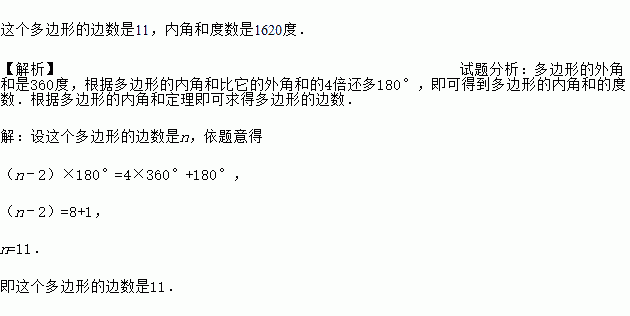 一个多边形,它的内角和比外角和的4倍多180°,求这个多边形的边数及内角和度数。