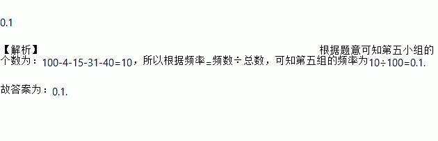 已知样本的100个数据分别落在5个小组内,第一,二,三,四小组的个数分别为4,15,31,40,则第五组的频率为_________.