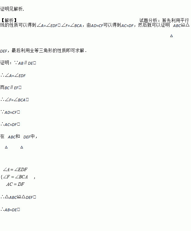 已知AB∥DE,BC∥EF,D,C在AF上,且AD=CF,求证:△ABC≌△DEF.