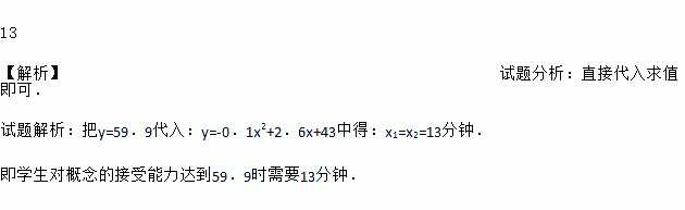 13 【解析】试题分析:直接代入求值即可. 试题解析:把y=59.9代入:y=-0.1x2+2.6x+43中得:x1=x2=13分钟. 即学生对概念的接受能力达到59.9时需要13分钟.