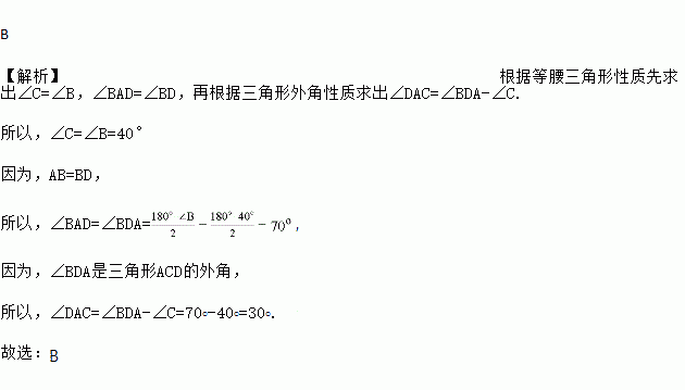 如图,在△ABC中,AB=AC,∠B=40°,D为BC上一点,且AB=BD,则∠DAC的度数为( )