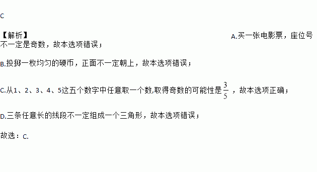 C ¡¾½âÎö¡¿A.ÂòÒ»ÕŵçӰƱ£¬×ùλºÅ²»Ò»¶¨ÊÇÆæÊý£¬¹Ê±¾Ñ¡Ïî´íÎó£» B.ͶÖÀһö¾ùÔȵÄÓ²±Ò£¬ÕýÃæ²»Ò»¶¨³¯ÉÏ£¬¹Ê±¾Ñ¡Ïî´íÎó£» C.´Ó1¡¢2¡¢3¡¢4¡¢5ÕâÎå¸öÊý×ÖÖÐÈÎÒâȡһ¸öÊý,È¡µÃÆæÊýµÄ¿ÉÄÜÐÔÊÇ£¬¹Ê±¾Ñ¡ÏîÕýÈ·£» D.ÈýÌõÈÎÒⳤµÄÏ߶β»Ò»¶¨×é³ÉÒ»¸öÈý½ÇÐΣ¬¹Ê±¾Ñ¡Ïî´íÎó£» ¹ÊÑ¡£ºC.
