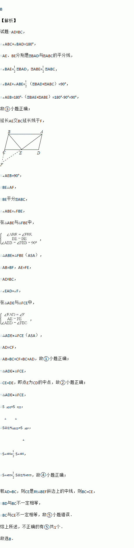 如图,在四边形ABCD中,AD∥BC,若∠DAB的角平分线AE交CD于E,连接BE,且BE边平分∠ABC,则以下命题不正确的个数是①BC+AD=AB;②E为CD中点;③∠AEB=90°;④S△ABE=
