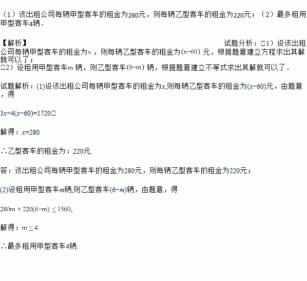 (2)若学校计划租用6辆客车,租车的总租金不超过1560元,那么最多租用甲型客车多少辆?