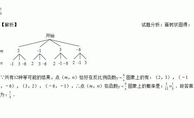 从﹣1,2,3,﹣6这四个数中任选两数,分别记作m,n,那么点(m,n)在函数y=图象上的概率是_____.