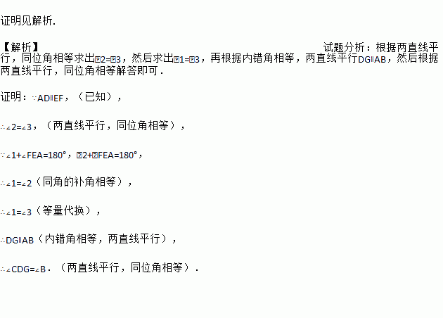 如图,在三角形ABC中,点D、F在边BC上,点E在边AB上,点G在边AC上,AD∥EF,∠1+∠FEA=180°.求证:∠CDG=∠B.