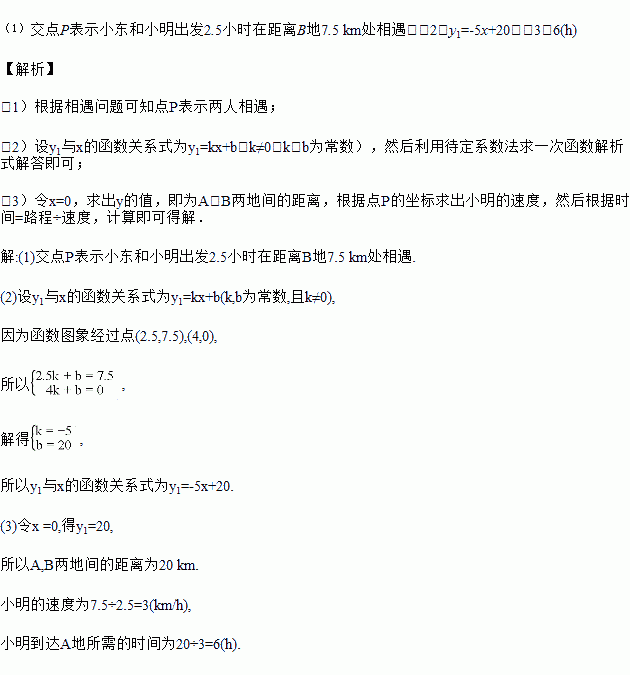小东从A地出发以某一速度向B地走去,同时小明从B地出发以另一速度向A地走去,y1,y2分别表示小东、小明离B地的距离y(km)与所用时间x(h)的关系,如图所示,根据图象提供的信息,回答下列问题: