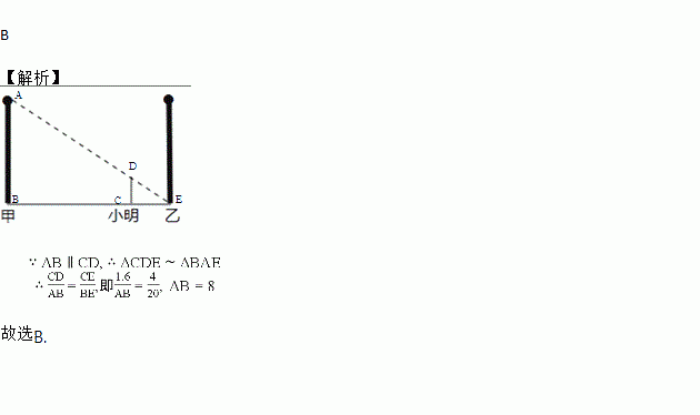 如图,甲、乙两盏路灯杆相距20米,一天晚上,当小明从灯甲底部向灯乙底部直行16米时,发现自己的身影顶部正好接触到路灯乙的底部已知小明的身高为![]()