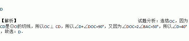 如图,AB、AC是⊙O的两条弦,∠BAC=25°,过点C的切线与OB的延长线交于点D,则∠D的度为( )
