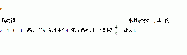 从标有1到9序号的9张卡片中任意抽取一张,抽到序号是偶数的概率是( )