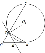 分析 (1)连结OD,如图,利用圆周角相等得∠ADB=90°,则∠A+∠ABD=90°,而∠BDE=∠A,∠OBD=∠ODB,所以∠BDE+∠ODB=90°,于是根据切线的判定定理得DE是圆O的切线;