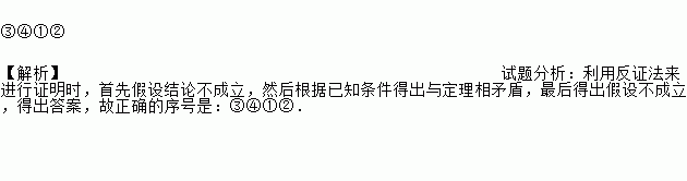 已知△ABC中,AB=AC,求证∠B<90°,下面写出了用反证法证明过程中的四个步骤:①所以∠B+∠C+∠A>180°,这与三角形内角和定理相矛盾;②所以∠B<90°;③假设∠B≥90°;④那么由AB=AC,得∠B=∠C≥90°,即∠B+∠C≥180°.这四个步骤正确的顺序应是_________(填序号).