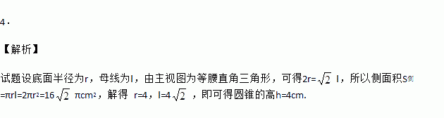 一个侧面积为16πcm2的圆锥,其主视图为等腰直角三角形,则这个圆锥的高为 cm.