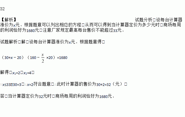 某商场销售一种学生用计算器,进价为每台20元,售价为每台30元时,每周可卖160台,如果每台售价每上涨2元,每周就会少卖20台,但厂家规定最高每台售价不能超过33元,当计算器定价为多少元时,商场每周的利润恰好为1680元?