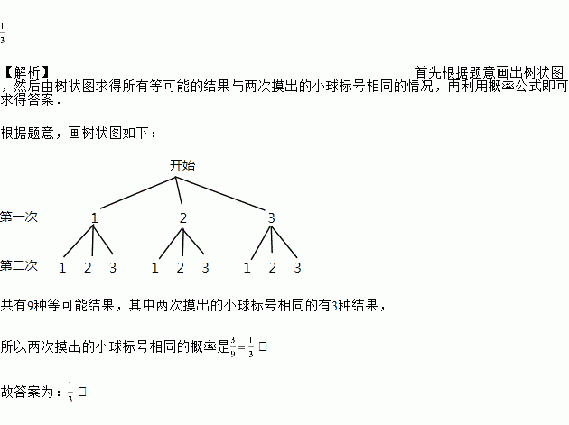 一个不透明的口袋中有三个完全相同的小球,把它们分别标号为1,2,3.随机摸出一个小球然后放回,再随机摸出一个小球,则两次摸出的小球标号相同的概率是_____.