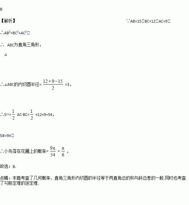 (2016·呼和浩特中考)如图,△ABC是一块绿化带,将阴影部分修建为花圃,已知AB=15,AC=9,BC=12,阴影部分是△ABC的内切圆,一只自由飞翔的小鸟将随机落在这块绿化带上,则小鸟落在花圃上的概率为( )