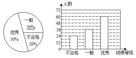 对全校学生进行文明礼仪知识测试,为了了解测试结果,随机抽取部分学生的成绩进行分析,将成绩分为三个等级:不合格、一般、优秀,并绘制成如下两幅统计图(不完整).