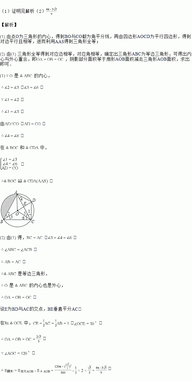 如图,O是的内心,BO的延长线和的外接圆相交于D,连结DC、DA、OA、OC,四边形OADC为平行四边形.