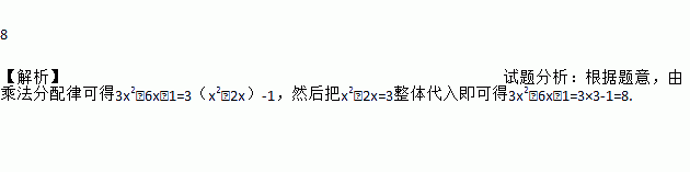 8 【解析】试题分析:根据题意,由乘法分配律可得3x2﹣6x﹣1=3(x2﹣2x)-1,然后把x2﹣2x=3整体代入即可得3x2﹣6x﹣1=3×3-1=8.