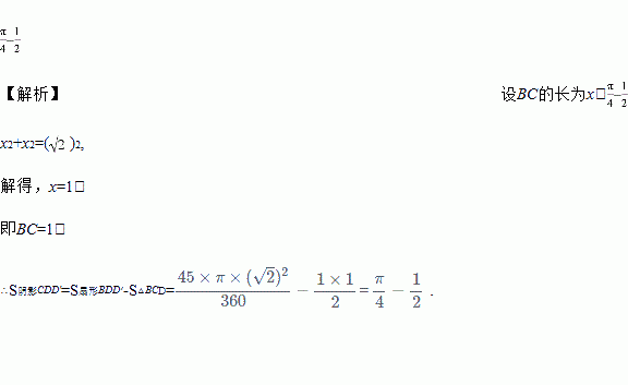 如图,在正方形ABCD中,对角线BD的长为.若将BD绕点B旋转后,点D落在BC延长线上的点D′处,点D经过的路径为弧DD′,则图中阴影部分的面积是________.