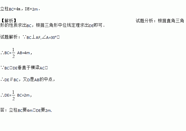 如图是屋架设计图的一部分,其中∠A=30°,点D是斜梁AB的中点,BC、DE垂直于横梁AC,AB=8cm,则立柱BC,DE要多长?