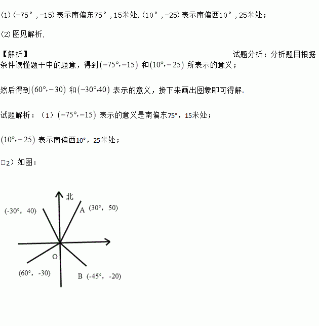 如果规定北偏东30°的方向记作30°,沿这个方向行走50米记作50,图中点A记作(30°,50),北偏西45°记作-45°,沿着该方向的反方向走20米记作-20,图中点B记作(-45°,-20),问: