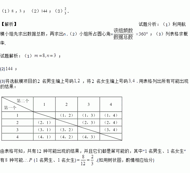 (3)从选航模项目的4名学生中随机选取2名学生参加学校航模兴趣小组训练,请用列举法(画树状图或列表)求所选取的2名学生中恰好有1名男生、1名女生的概率.