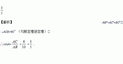 在△ABC中,AB=10,AC=6,BC=8,则cosA的值为________.