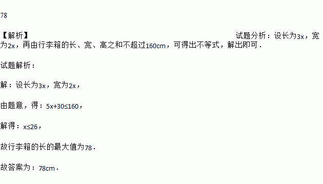 铁路部门规定旅客免费携带行李箱的长宽高之和不超过160cm,某厂家生产符合该规定的行李箱,已知行李箱的高为30cm,长与宽之比为3:2,则该行李箱长度的最大值是 cm.