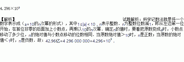 据报道,至2008年5月1日零时,田湾核电站1、2号两台机组今年共累计发电42.96亿千瓦时.“42.96亿”用科学记数法可表示为__________________.