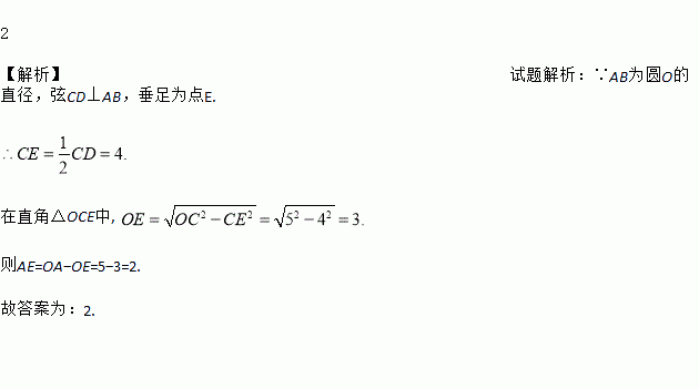 如图,AB为圆O的直径,弦CD⊥AB,垂足为点E,连接OC,若OC=5,CD=8,则AE=_____.
