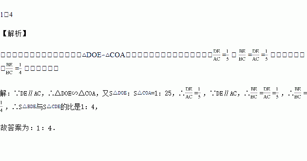 如图,D、E分别是△ABC的边AB、BC上的点,且DE∥AC,AE、CD相交于点O,若S△DOE:S△COA=1:25,则S△BDE与S△CDE的比=________.