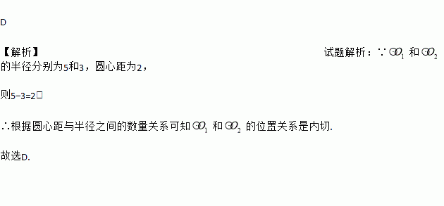 D 【解析】试题解析:∵和的半径分别为5和3,圆心距为2, 则5?3=2, ∴根据圆心距与半径之间的数量关系可知和的位置关系是内切. 故选D.