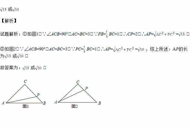 在等腰直角三角形ABC中,∠ACB=90°,AC=3,点P为边BC的三等分点,连接AP,则AP的长为_______.