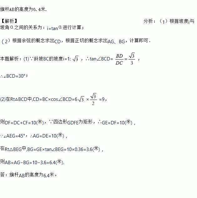 如图山坡上有一根旗杆AB,旗杆底部B点到山脚C点的距离BC为