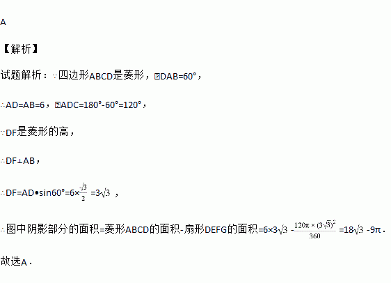 如图,在边长为6的菱形ABCD中,∠DAB=60°,以点D为圆心,菱形的高DF为半径画弧,交AD于点E,交CD于点G,则图中阴影部分的面积是( )