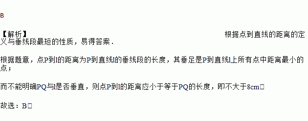若直线l上一点P和直线l外一点Q的距离为8 cm,则点Q到直线l的距离是( )