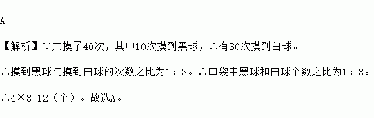 (2013年四川资阳3分)在一个不透明的盒子里,装有4个黑球和若干个白球,它们除颜色外没有任何其他区别,摇匀后从中随机摸出一个球记下颜色,再把它放回盒子中,不断重复,共摸球40次,其中10次摸到黑球,则估计盒子中大约有白球【 】