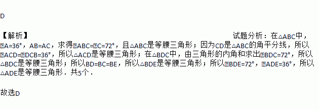 D 【解析】试题分析:在△ABC中,∠A=36°,AB=AC,求得∠ABC=∠C=72°,且△ABC是等腰三角形;因为CD是△ABC的角平分线,所以∠ACD=∠DCB=36°,所以△ACD是等腰三角形;在△BDC中,由三角形的内角和求出∠BDC=72°,所以△BDC是等腰三角形;所以BD=BC=BE,所以△BDE是等腰三角形;所以∠BDE=72°,∠ADE=36°,所以△ADE是等腰三角形....