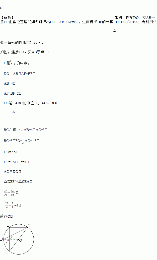 如图.Rt△ABC内接于⊙O,BC为直径,AB=4,AC=3,D是弧AB 的中点,CD与AB的交点为E,则 等于( )