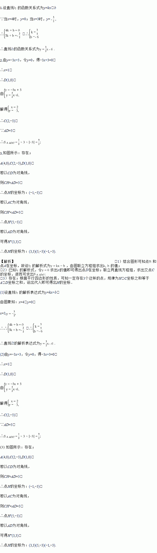 3.(3)若点H为坐标平面内任意一点,在坐标平面内是否存在这样的点H,使以A、D、C、H为顶点的四边形是平行四边形?若存在,请直接写出点H的坐标;若不存在,请说明理由.![]()