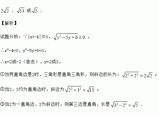 已知直角三角形两边x、y的长满足|x2-4|+=0,则第三边长为 .