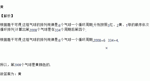 一次大型运动会上,工作人员按照 3 个红气球,2 个黄气球,1 个绿气球的顺序把气球 穿起来装饰运动场,那么第 2008 个气球是__________颜色的(填“红”、“黄”或“绿”)