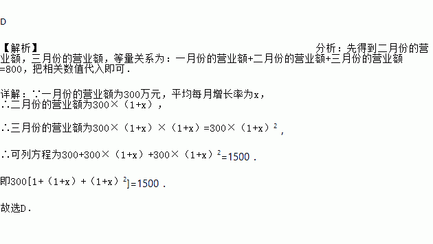 某超市一月份的营业额为300万元,第一季度的营业额共为1500万元,如果平均每月增长率为,则由题意可列方程为( )![]()