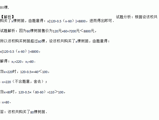 一学校为了绿化校园环境,向某园林公司购买了一批树苗,园林公司规定:如果购买树苗不超过60棵,每棵售价为120元;如果购买树苗超过60棵,每增加1棵,所出售的这批树苗每棵售价均降低0.5元,但每棵树苗最低售价不得少于100元,该学校最终向园林公司支付了8800元;请问学校购买了多少棵树苗?