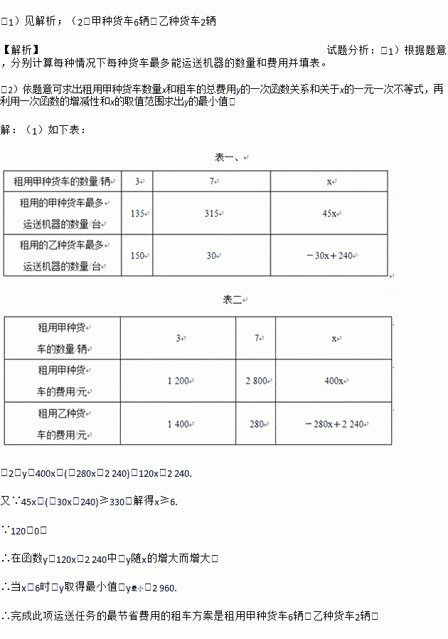 (2016¡¤Ìì½ò)¹«Ë¾ÓÐ330̨»úÆ÷ÐèÒªÒ»´ÎÐÔÔËË͵½Ä³µØ£¬¼Æ»®×âÓüס¢ÒÒÁ½ÖÖ»õ³µ¹²8Á¾£¬ÒÑ֪ÿÁ¾¼×ÖÖ»õ³µÒ»´Î×î¶àÔËËÍ»úÆ÷45̨£¬×â³µ·ÑÓÃΪ400Ôª£¬Ã¿Á¾ÒÒÖÖ»õ³µÒ»´Î×î¶àÔËËÍ»úÆ÷30̨£¬×â³µ·ÑÓÃΪ280Ôª£®
