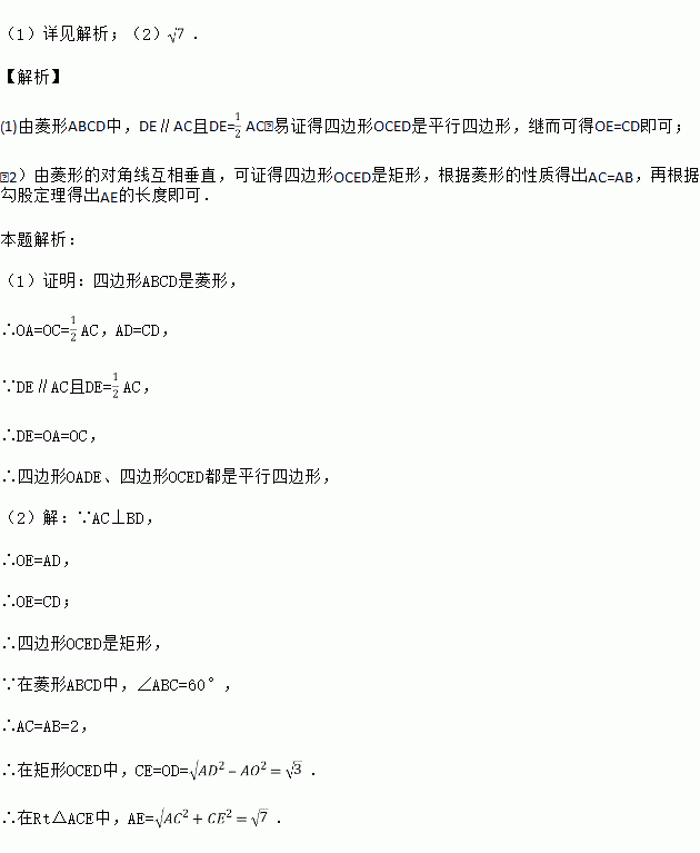 (2)若菱形ABCD的边长为2,∠ABC=60°.求AE的长.