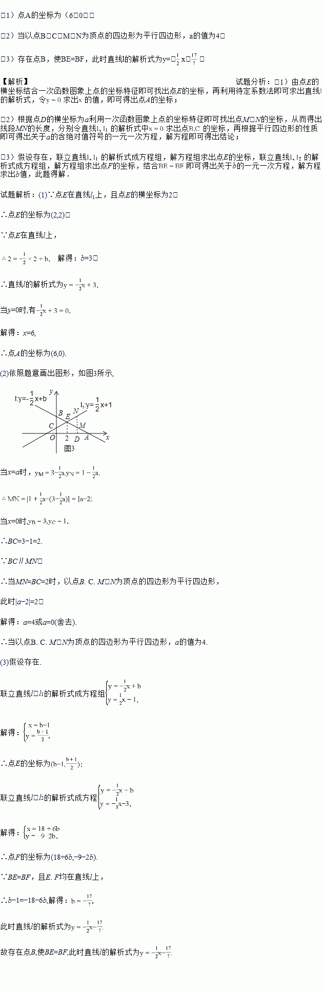 x﹣3的交点为F,问是否存在点B,使BE=BF,若存在,求出直线l的解析式,若不存在,请说明理由.
